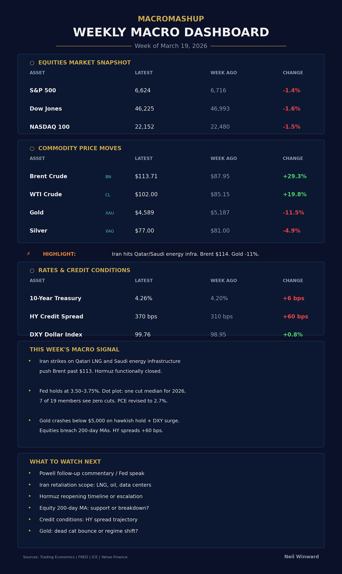 This week the tension between silicon and steel stopped being a thesis and became a price. Iranian strikes on Qatari LNG facilities and Saudi energy infrastructure pushed Brent crude past $113 — up nearly 30% from a week ago — while the Hormuz corridor moved from “effectively closed by behavior” to functionally shut, with tanker traffic at near-zero through the strait.