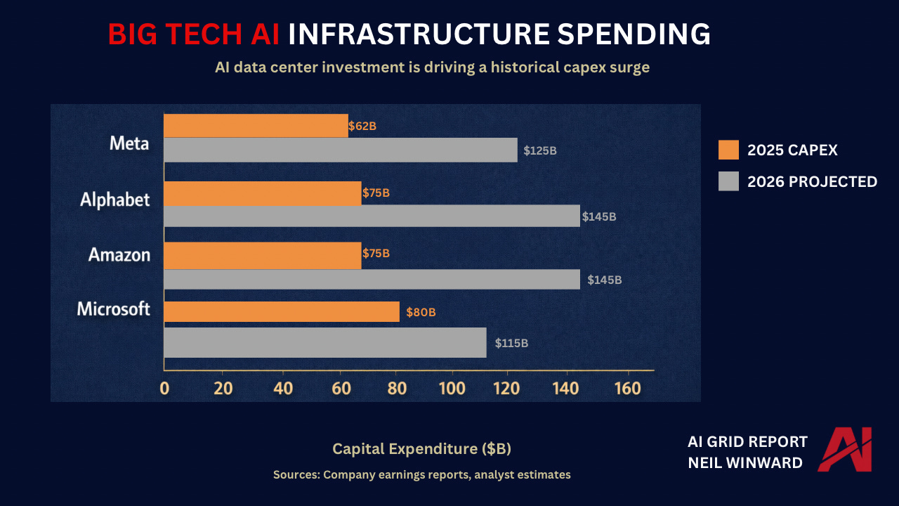 Microsoft, Alphabet, Amazon, and Meta alone are projected to spend hundreds of billions of dollars annually on data centers, chips, and related infrastructure.