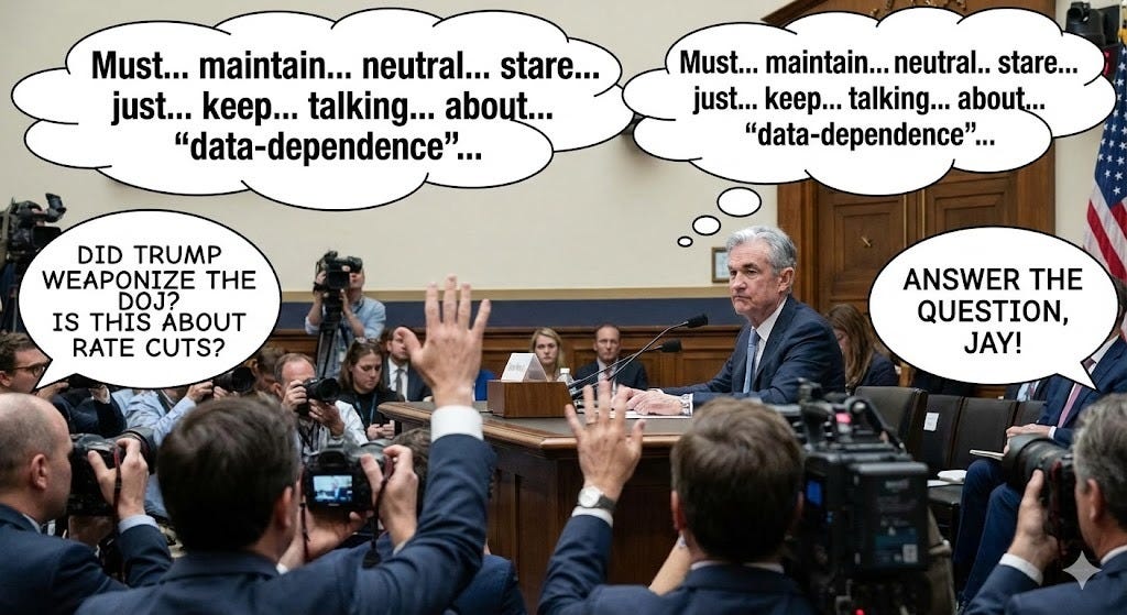 Policy remains nominally unchanged. The language is softer. Powell is stuck in the narrow corridor where inflation isn’t dead, growth isn’t dead — but political tolerance for pain very much is. The only thing reporters really wanted to talk about wasn’t policy at all. It was politics…